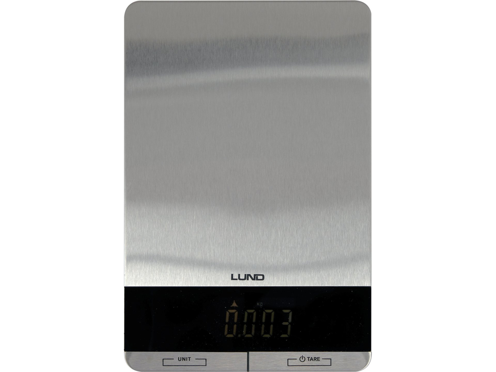 Кухонні ваги LUND з пластиною з нержавіючої сталі. Оснащені легким для читання РК-дисплеєм, що відображає 4 одиниці вимірювання ваги на вибір, а також індикаторами перевантаження та низького заряду батареї. Максимальне навантаження до 5 кг