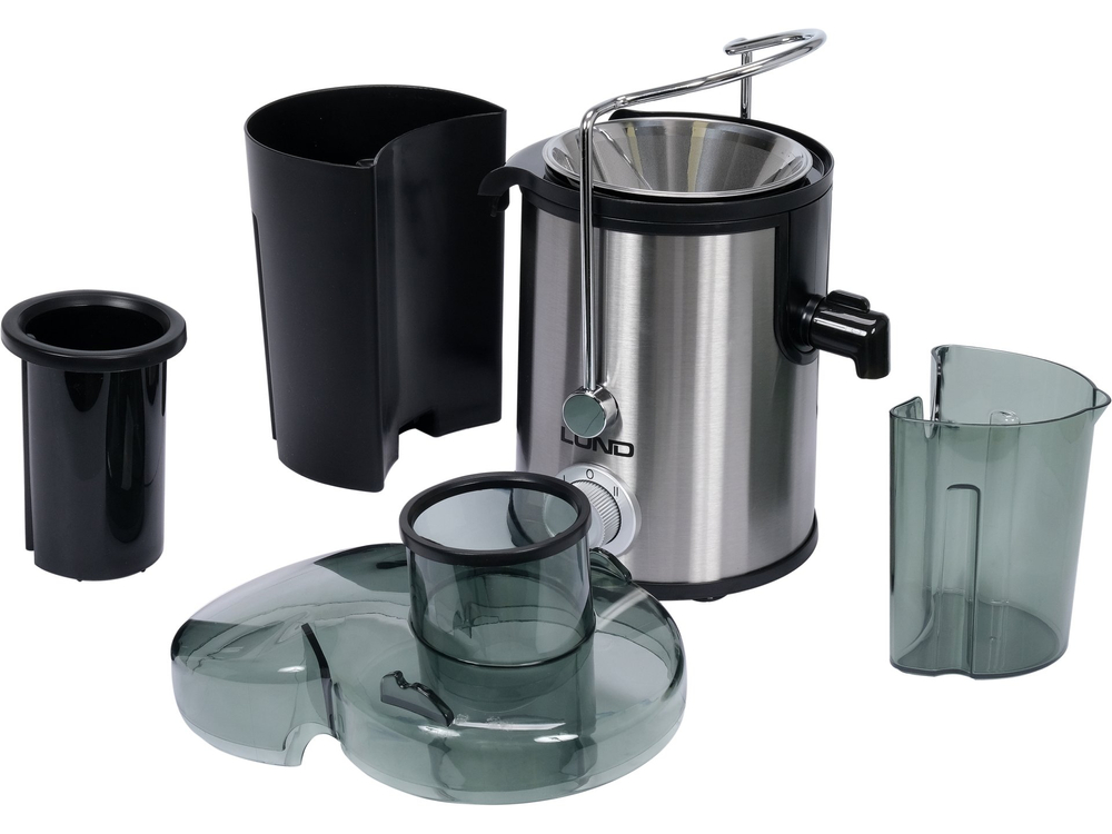 Високошвидкісна соковижималка від LUND з потужним двигуном 600 Вт та 2-рівневим регулюванням швидкості до 13 000 об/хв. Вхідний отвір шириною 65 мм дозволяє закидати великі шматки