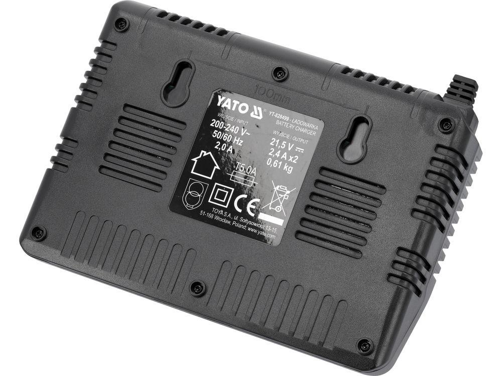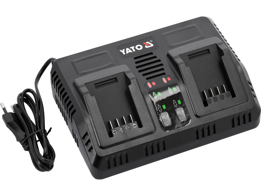 Подвійний зарядний пристрій для всіх 18-вольтових системних акумуляторів YATO. Заряджає як дві батареї одночасно, так і окремо. Вбудована система тестування продуктивності та температури акумулятора піклується про термін його служби. Не починає заряджати, коли елементи занадто гарячі. У разі зберігання акумулятора при мінусовій температурі, зарядка починається, коли температура батареї досягає +5 градусів Цельсія.