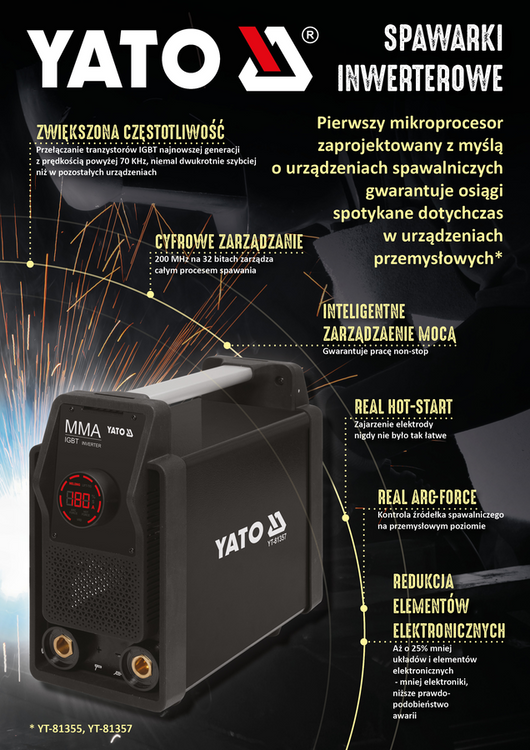 Захист від перевантаження і перегріву (вентилятор на вимогу ) - мікропроцесор в YT-81357 перевіряє температуру критичних компонентів в режимі реального часу. Залежно від температури, він спочатку контролює швидкість вентилятора, але коли температура досягає занадто високого рівня, мікропроцесор плавно зменшує вихідний струм, дозволяючи електроду перегоріти або завершити зварювання контрольованим способом. У більшості зварювальних апаратів, представлених на ринку, момент перегріву означає, що зварювальний струм негайно вимикається, що часто закінчується необхідністю механічного регулювання деталей, що зварюються. Ця проблема не виникає з YT-81357.
