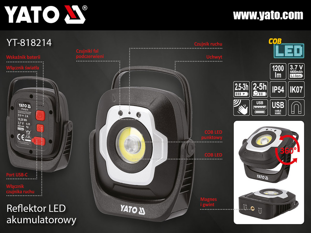 Переносний прожектор з можливістю запуску двома способами - вимикачем або датчиком руху. Активація сенсора шляхом махання рукою чудово справляється під час роботи забрудненими руками, у рукавичках або без можливості натиснення кнопки.